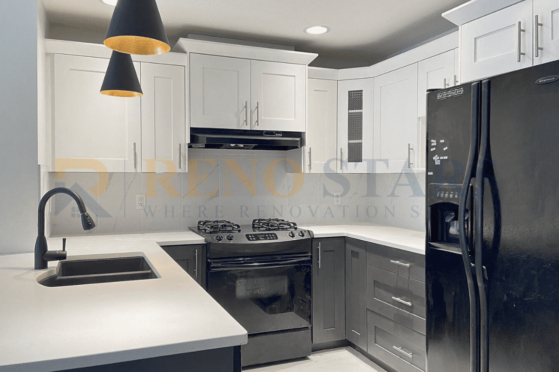 Lighting and color play a vital role in condo renovations, especially when working within limited spaces. In the Surrey kitchen project, neutral tones like white and gray helped open up the area, while black accents provided contrast and sophistication.