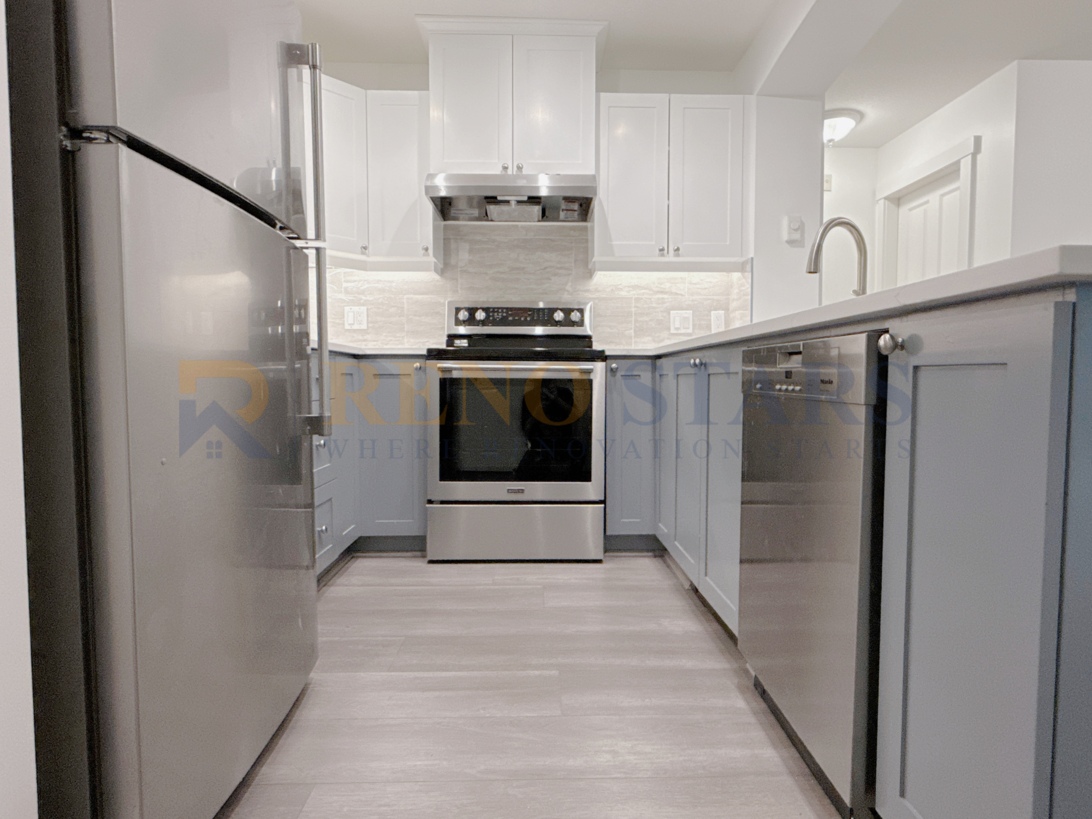 This kitchen renovation project in Coquitlam was designed to refresh the space with a new color scheme and modern finishes. The scope of work included repainting the countertops, redoing the flooring, and enhancing the lighting throughout the condo. With a budget of $25,000 to $27,000, the project was completed in 5-6 weeks.