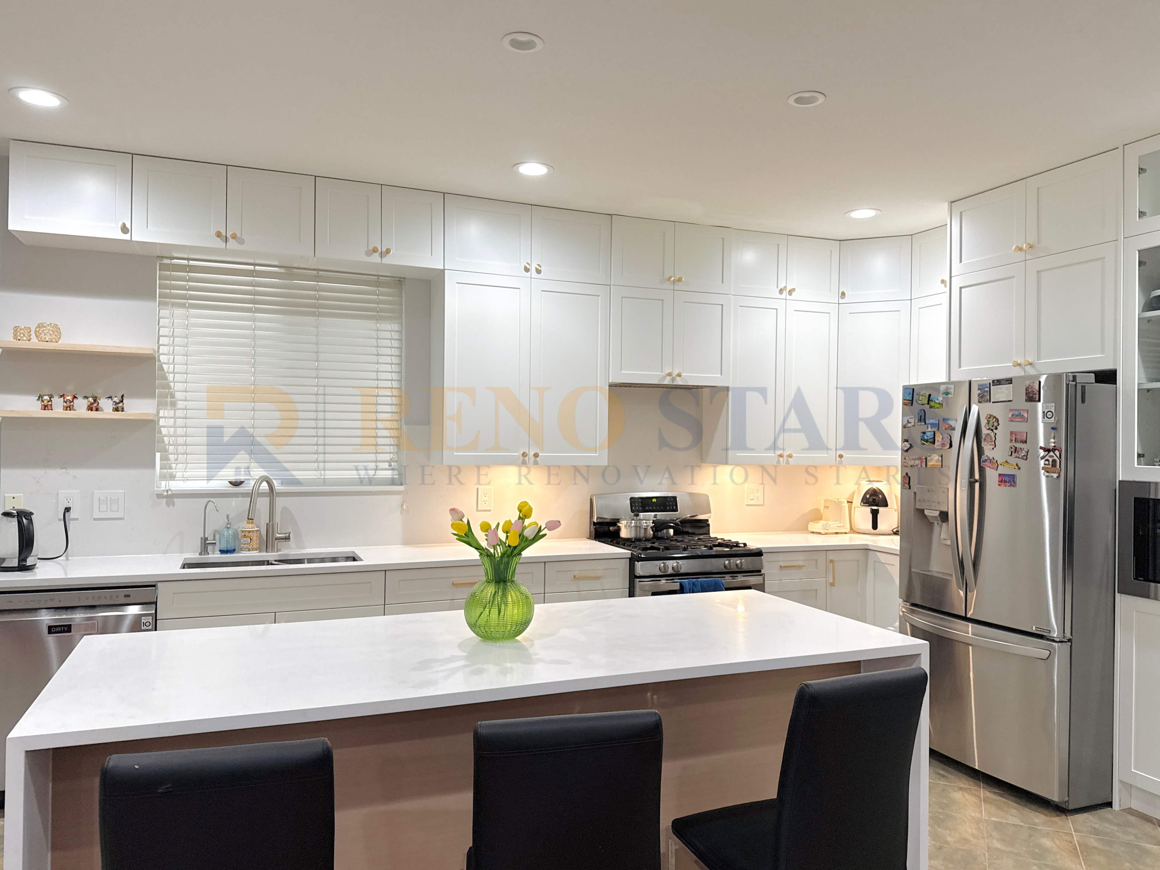 In the heart of Langley, BC, a stunning transformation took place in a modern kitchen renovation project. This case study explores how Reno Stars turned a dated kitchen into a sophisticated cooking space with elegant white shaker cabinets, gold handles, and contrasting silver fixtures.