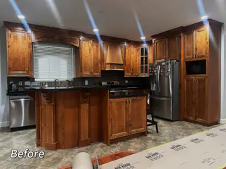 This Langley kitchen renovation project delivered a striking modern transformation featuring clean lines and premium materials throughout. The outdated kitchen was completely reimagined with sleek flat-panel cabinetry in a contemporary colour palette, complemented by a waterfall-edge quartz countertop that serves as the room's centrepiece. Full-height upper cabinets maximize vertical storage while creating an impressive floor-to-ceiling visual impact. The backsplash features large-format porcelain tiles in a coordinating tone, providing a seamless and easy-to-maintain surface. Modern integrated appliances — including a panel-ready dishwasher and built-in microwave — maintain the kitchen's streamlined aesthetic. Recessed LED pot lights and under-cabinet lighting ensure excellent task illumination. New luxury vinyl plank flooring provides durability and water resistance while adding warmth to the contemporary design. This Langley kitchen remodel showcases how modern design principles can create a highly functional and visually striking cooking and entertaining space.