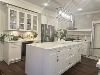 We addressed this by selecting a cohesive light color palette and incorporating custom cabinetry and a waterfall island that reflects both elegance and functionality.