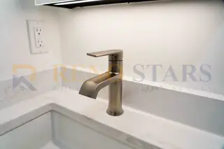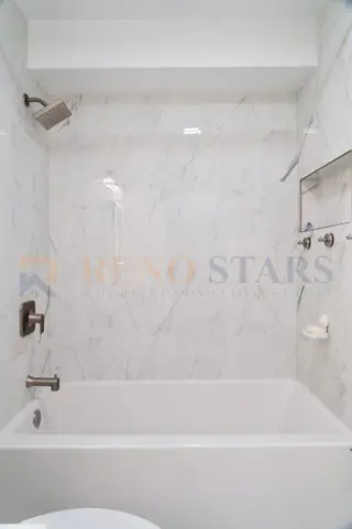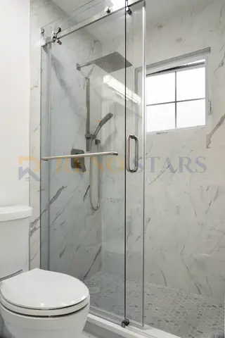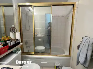 This project renovated two bathrooms in a Burnaby family townhouse, creating a unified yet distinctive aesthetic. One bathroom was transformed from a bathtub to a modern walk-in shower with linear drain and large white wall tiles, while the other retained its bathtub for young children. Coordinated white tile with brushed gold fixtures — faucets, showerheads, and towel bars — create a warm, elegant atmosphere. Frameless glass doors maximize natural light and visual space, while new exhaust fans and waterproofing ensure long-term performance.