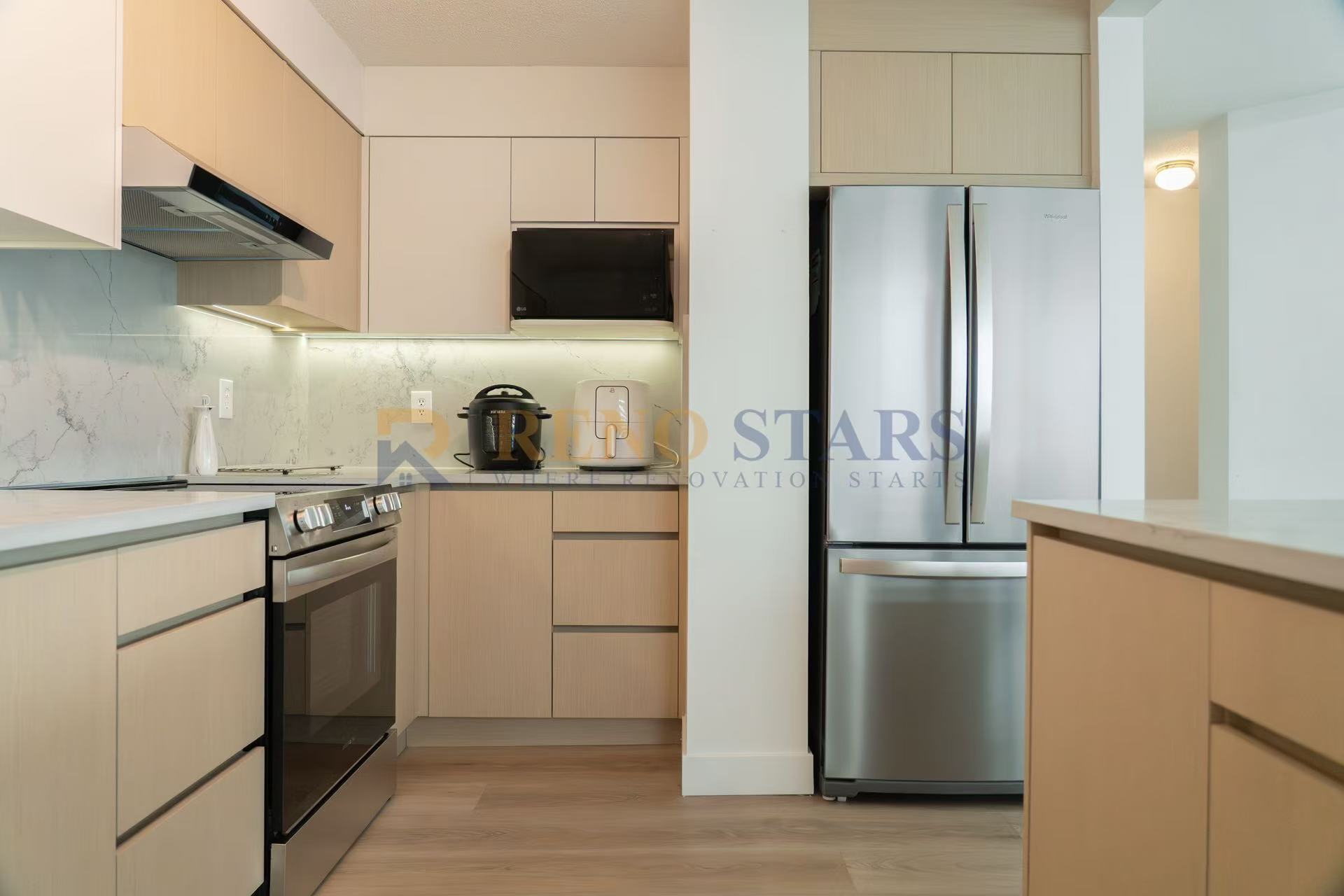 此翻新项目的重点是创建一个现代厨房,采用定制木纹和白色撞色柜子。项目预算在35,000至38,000美元之间,工期为4到5周。工作范围包括柜子安装、台面更换、挡水墙面铺贴、管道和照明。
